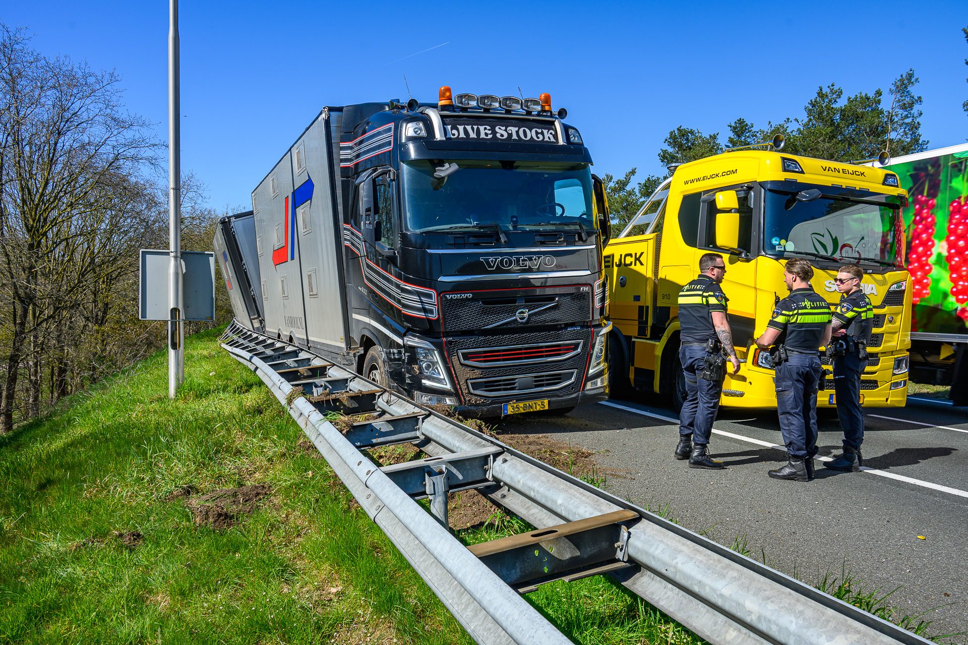 Vrachtwagen met varkens rijdt tegen de vangrail op