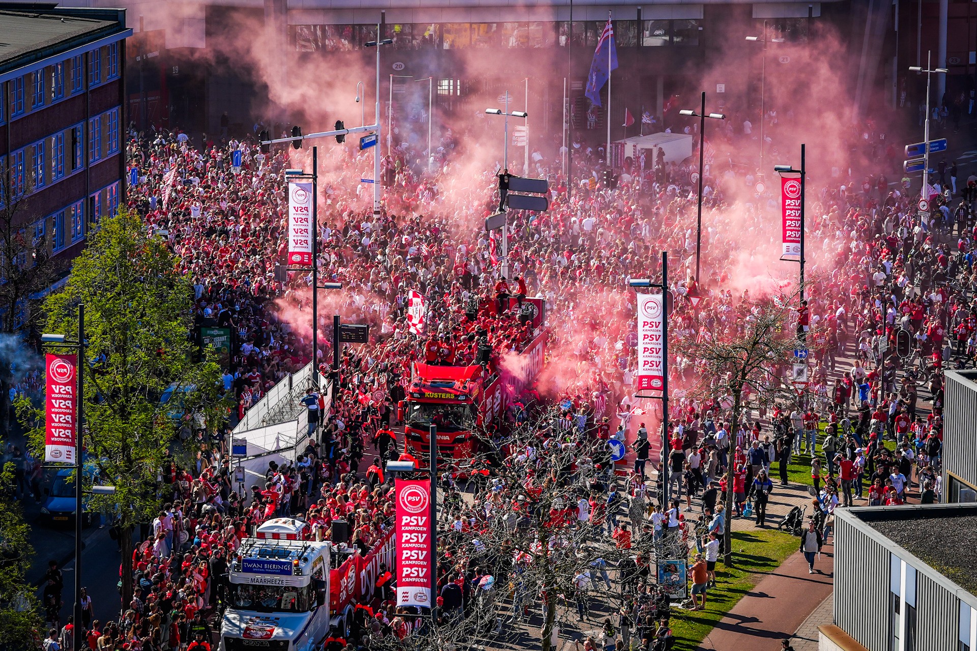 Geplaatst op 8 april 2026, om 21:24 uurEINDHOVEN – Tijdens de huldiging van PSV werden door de hele stad fakkels en vuurwerk afgestoken, ondanks een verbod. Inmiddels blijkt dat bijna 100 mensen zich met brandwonden hebben gemeld bij de EHBO.