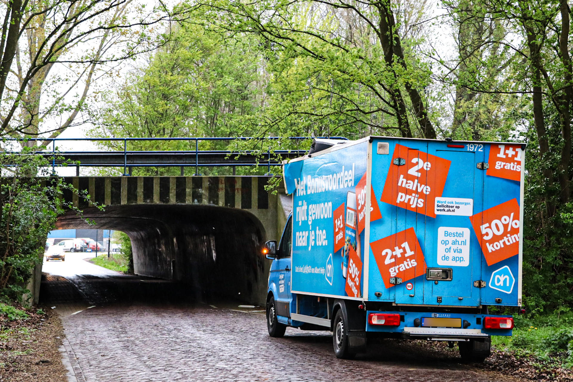 WASPIK – Een bestuurder van een boodschappenwagen van Albert Heijn heeft zaterdagmiddag zijn bakwagen beschadigd onder het beruchte viaduct aan de Blokenweg in Waspik.