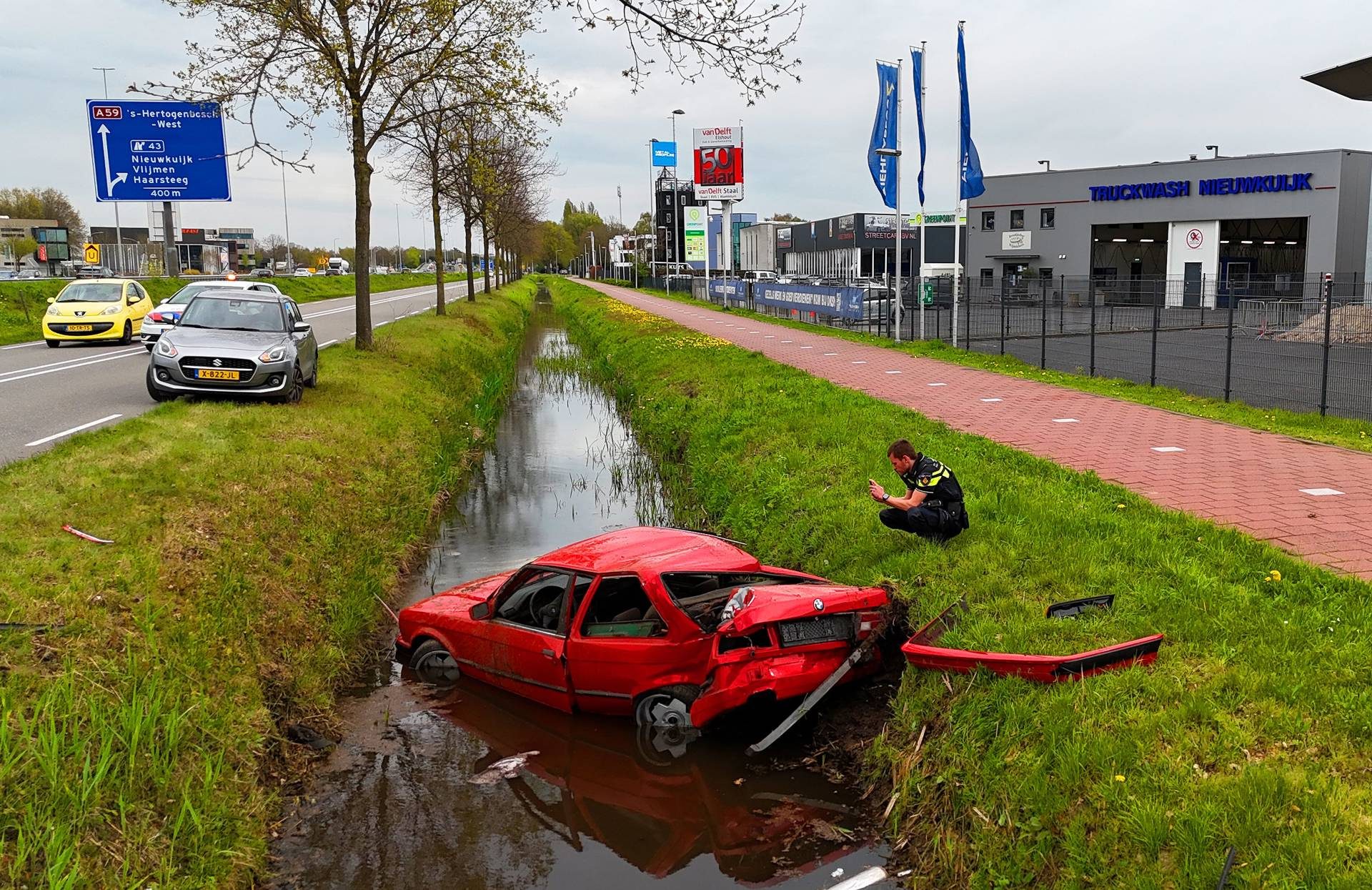 Het ongeval gebeurde iets na 15.00 uur, terwijl de bestuurder in de richting van Vlijmen reed. Om nog onbekende reden verloor hij de controle over zijn kersenrode BMW. Op het wegdek zijn duidelijke remsporen zichtbaar. Hulpdiensten kwamen ter plaatse en de bestuurder is voor controle naar het ziekenhuis gebracht.