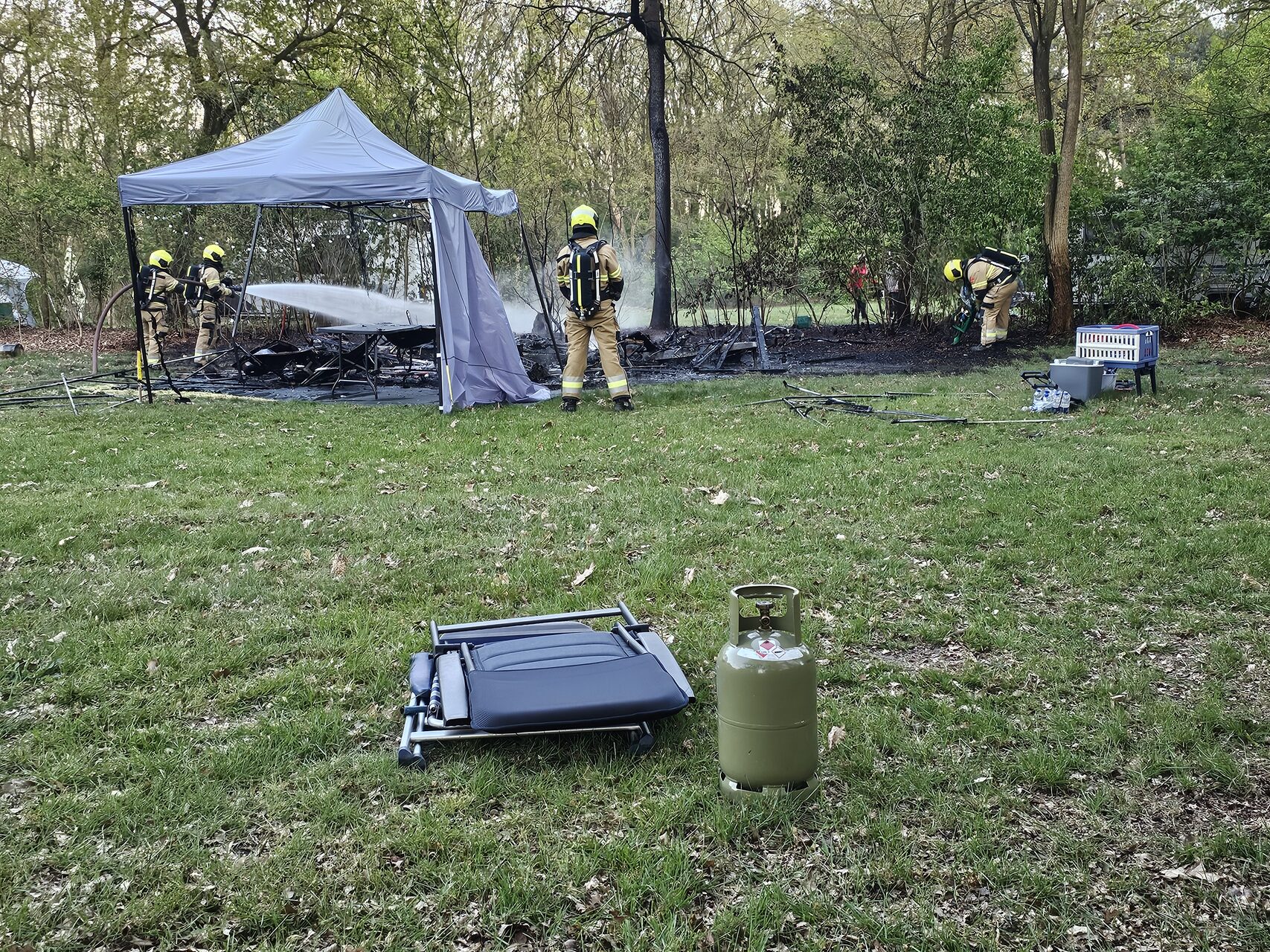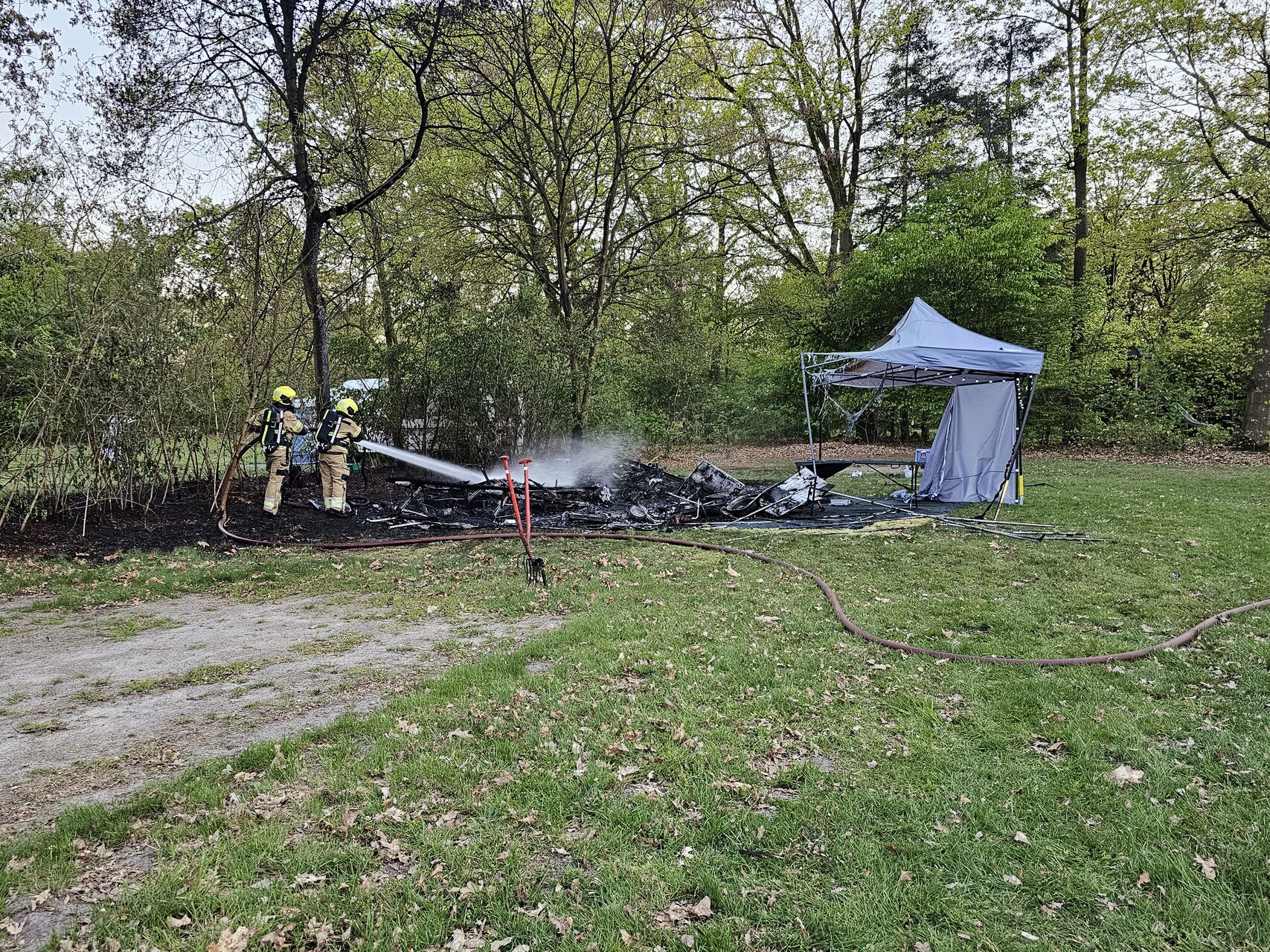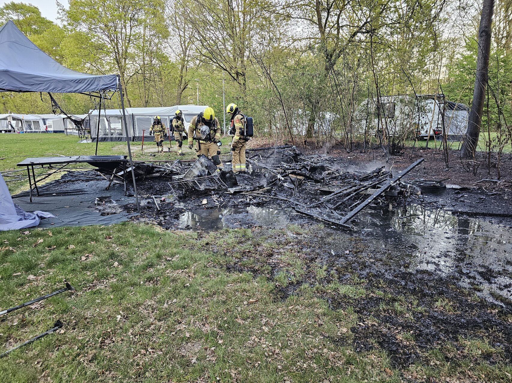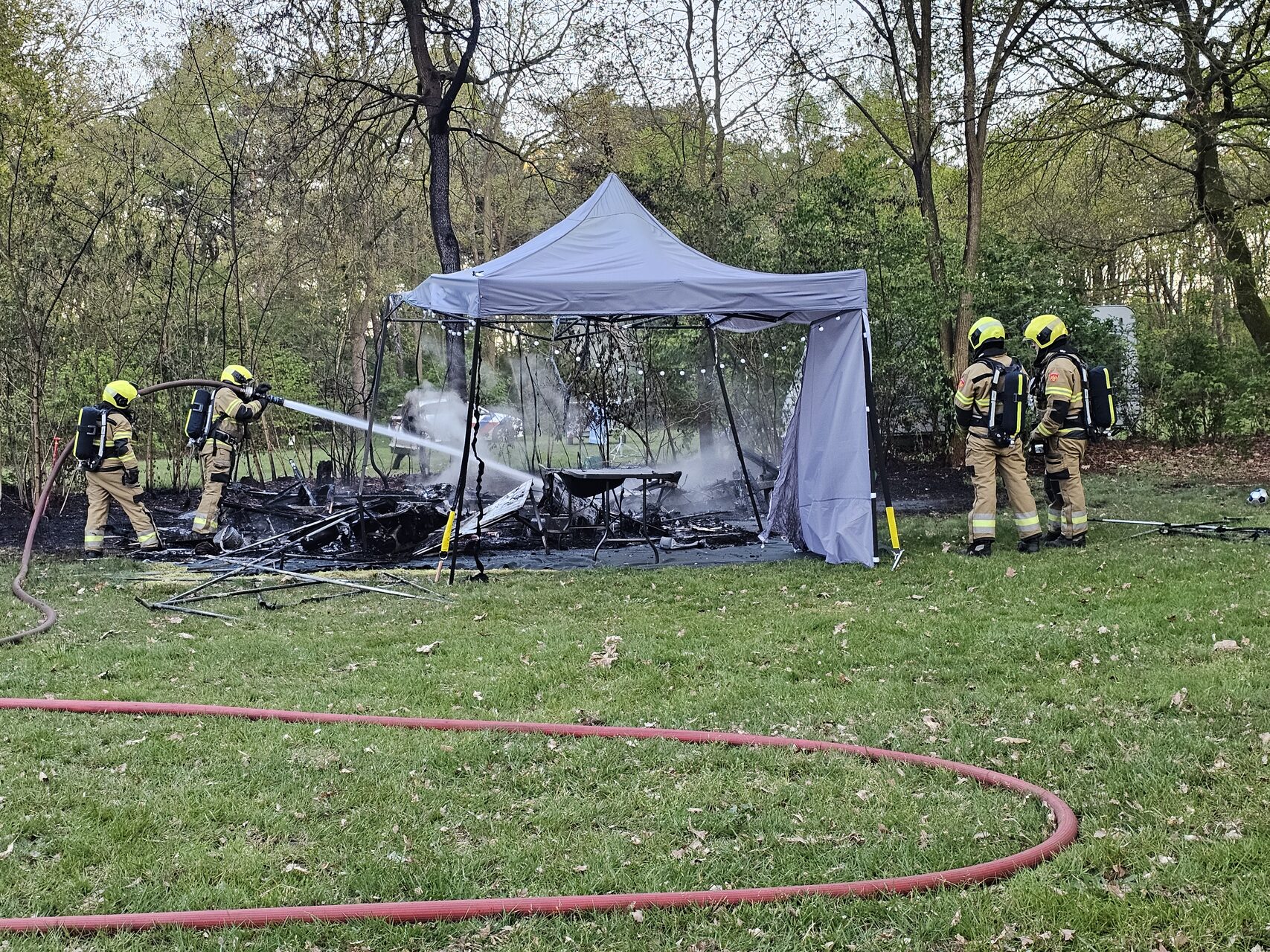 Voor de brandweer was er geen redden meer aan de caravan, die volledig uitbrandde. Ook de tent die zich nabij de caravan bevond, was door de intense hitte gedeeltelijk weggesmolten. Gelukkig kwamen de aanwezigen met de schrik vrij. Twee gasflessen waren op een veilige afstand gelegd en vormden geen gevaar.
