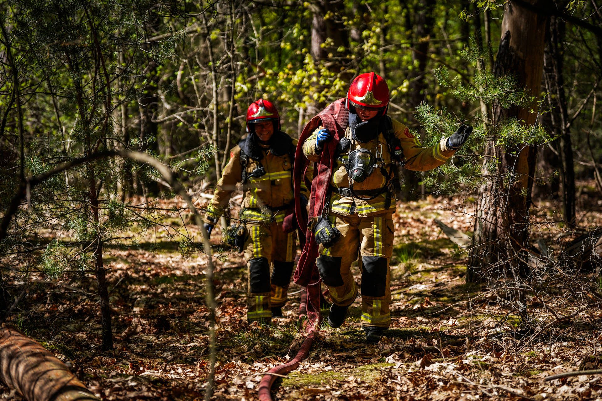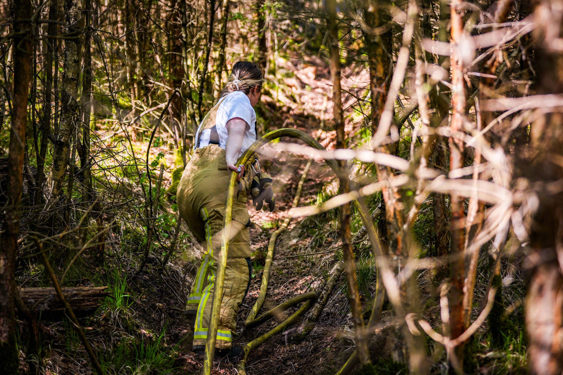 Bosbrand in moeilijk toegankelijk dennenbos