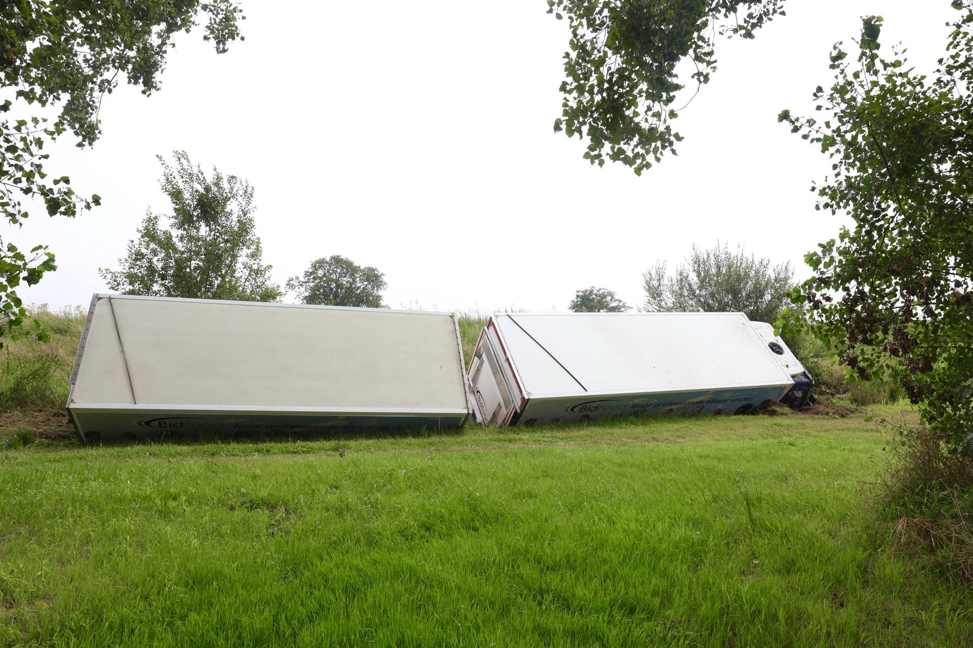 Brandweerlieden controleerden het voertuig maar konden snel terugkeren. De vrachtwagenchauffeur werd nagekeken maar raakte niet gewond. Het bergen van de zware combinatie zal een flinke operatie worden; een bergingsbedrijf is ingeschakeld om dit te regelen.