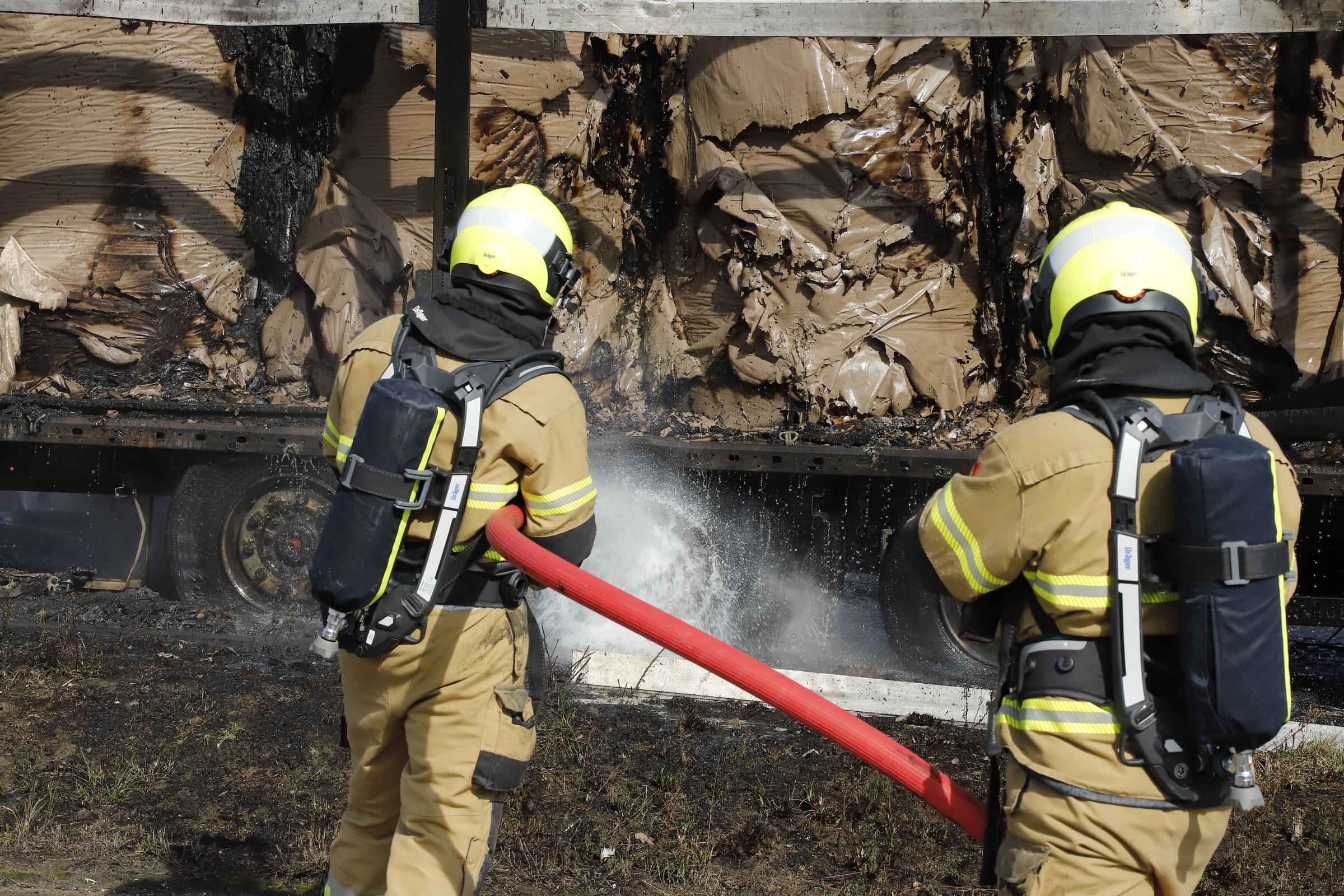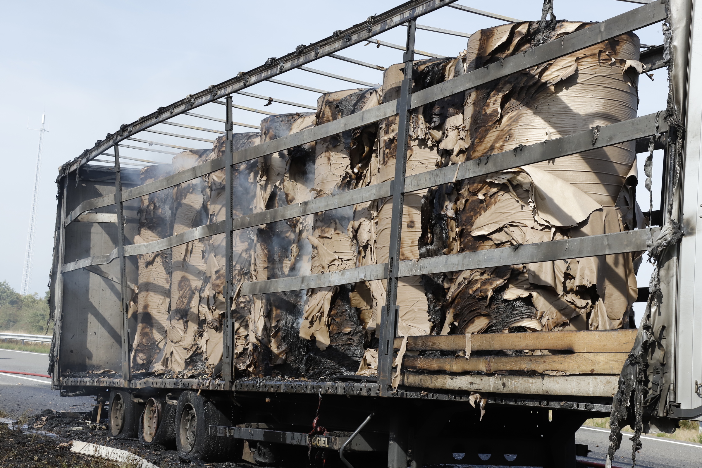 De brand brak rond 15.30 uit. Om de brand goed te kunnen blussen heeft de brandweer de rollen papier uit elkaar getrokken met een kraan. Vermoedelijk zijn vastgelopen remmen van de aanhanger de oorzaak van de brand.