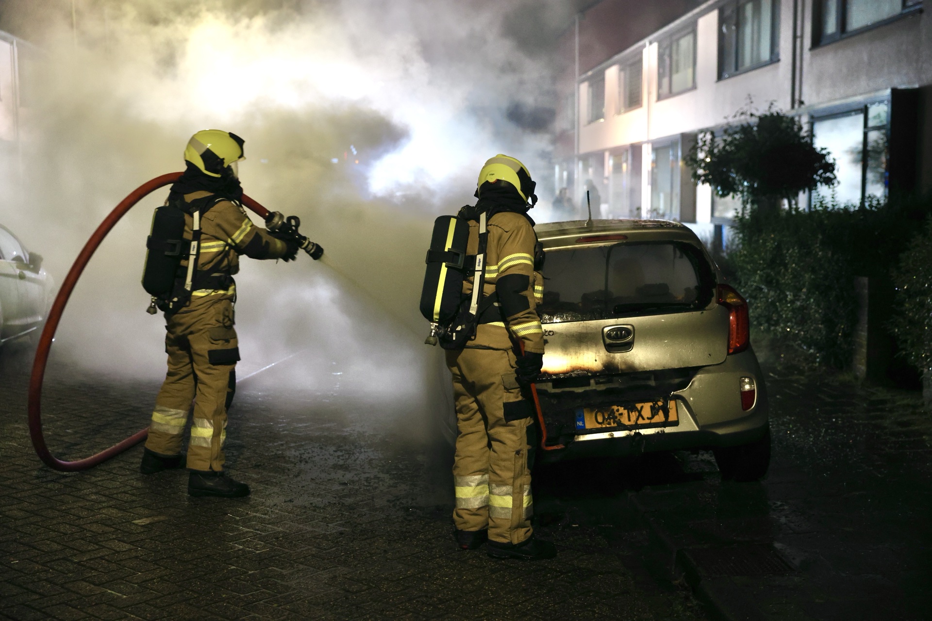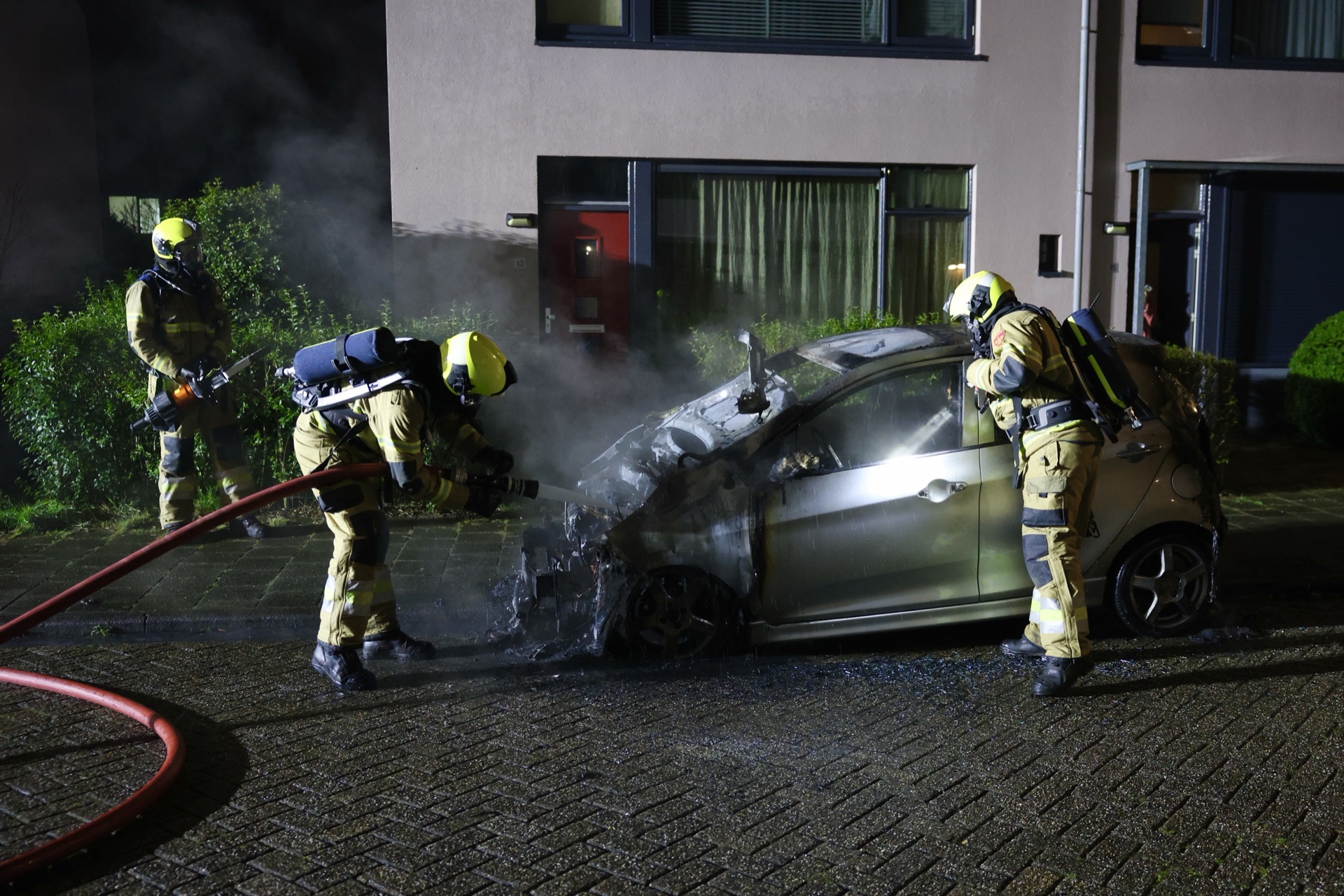 Bij aankomst sloegen de vlammen uit het voertuig, met hevige rookontwikkeling. De brandweer bluste het vuur, waarna een bergingsbedrijf het wrak afvoerde.