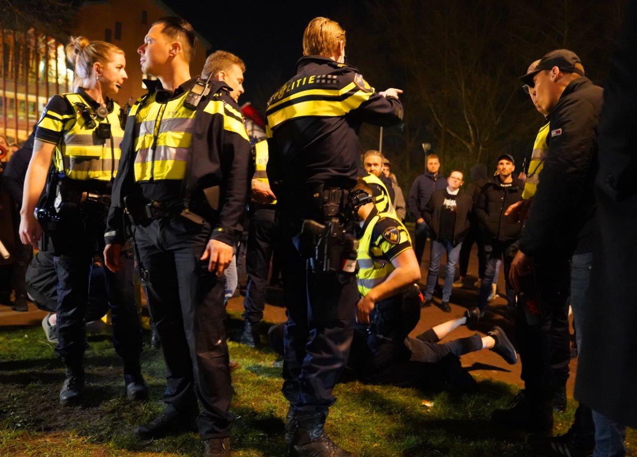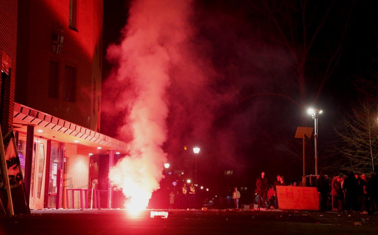 Demonstranten hingen spandoeken op, gooiden eieren en staken vuurwerk af. De stoep raakte bezaaid met rommel. Een persoon werd aangehouden voor het afsteken van zwaar vuurwerk. De politie hield toezicht en zette een drone in.