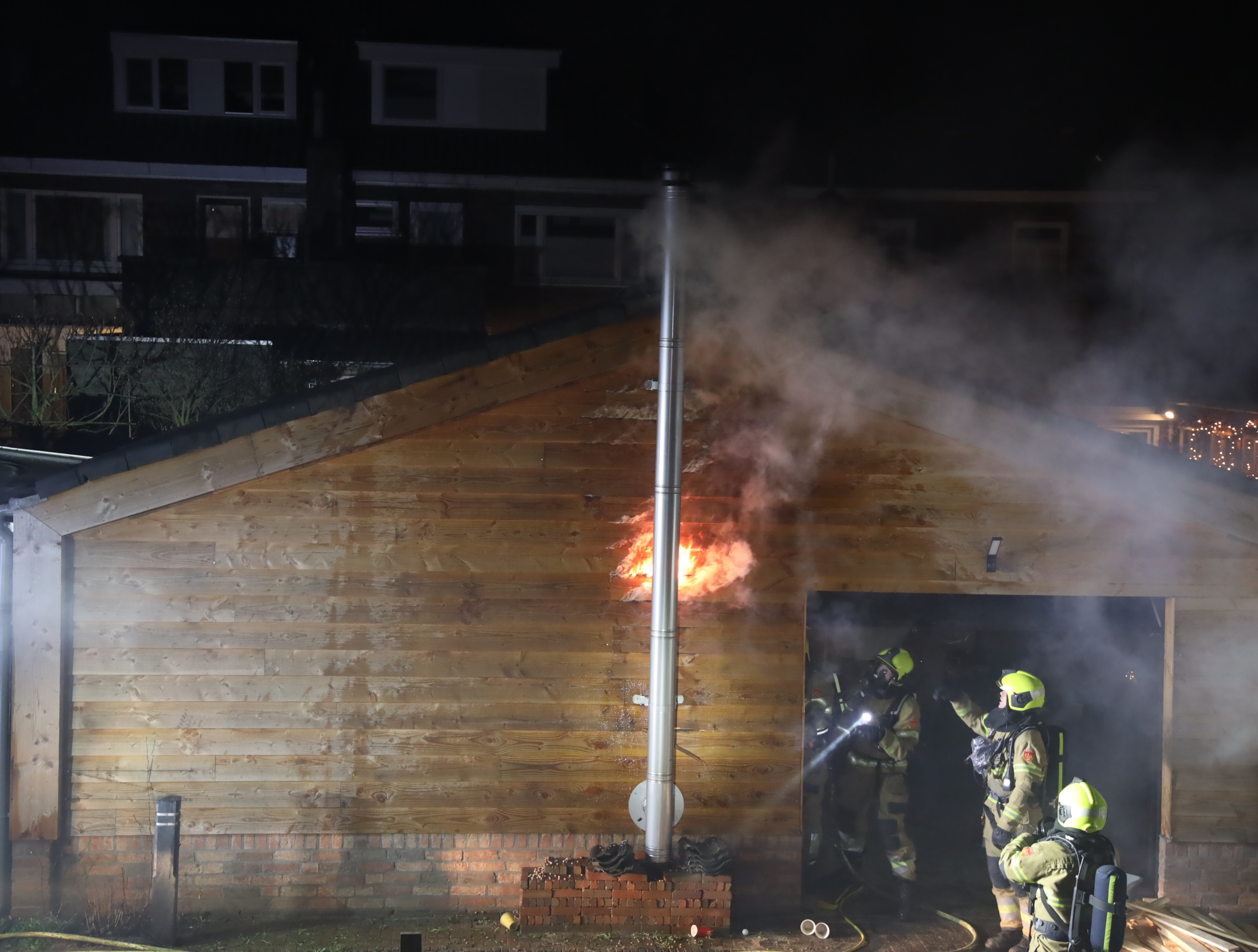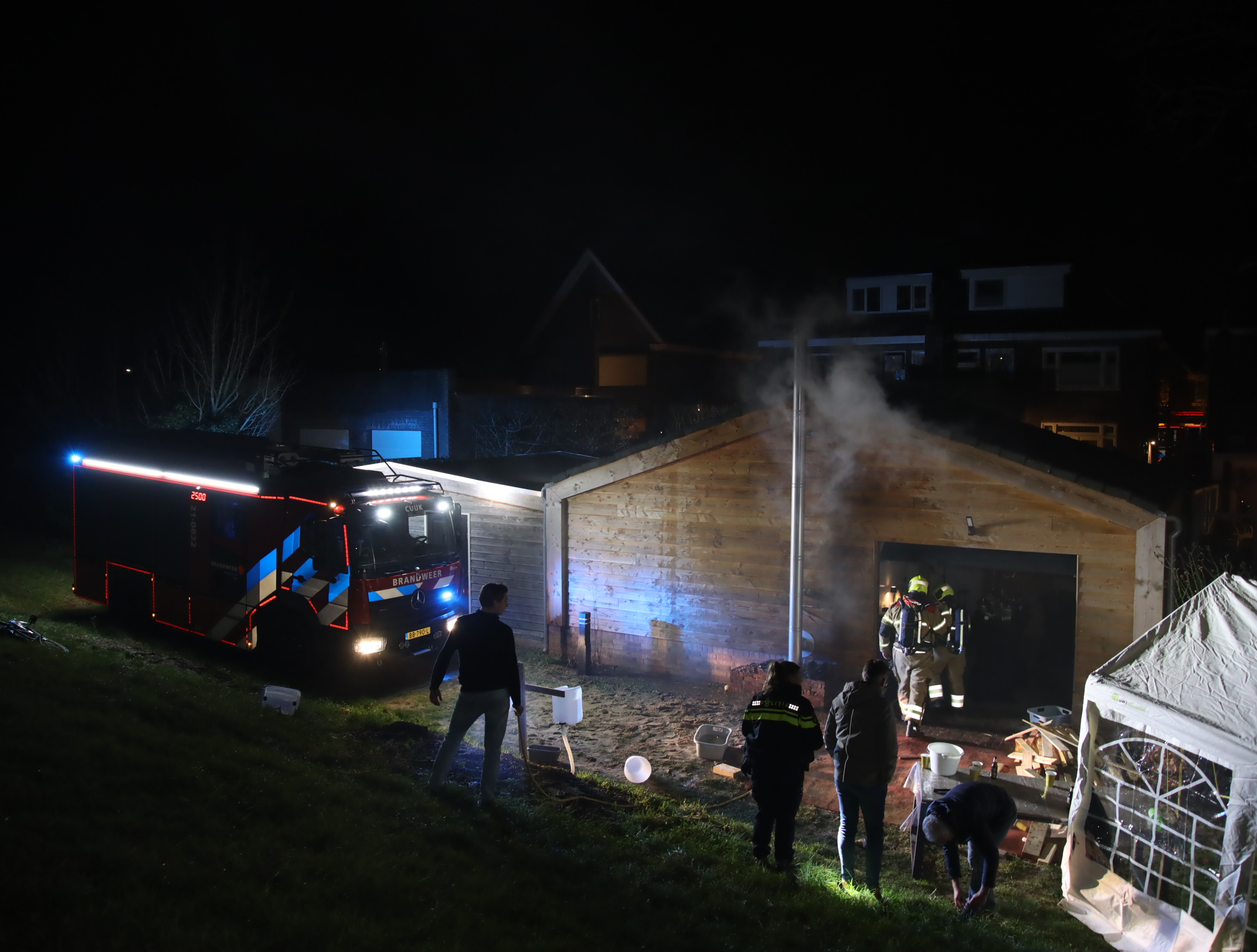 Aan de Grotestraat breekt brand uit in een houten schuur achter een woning. De brandweer sloopt delen van de wanden om de brandhaard te bereiken en is ter plaatse met een tankautospuit en hoogwerker.